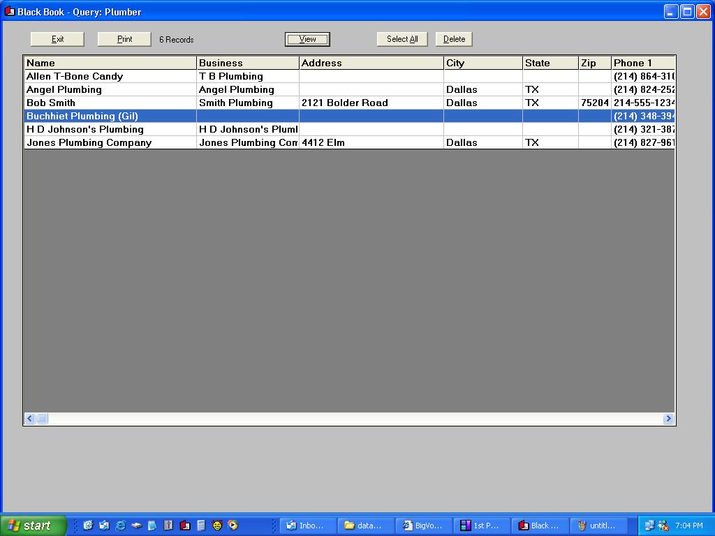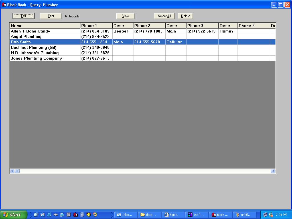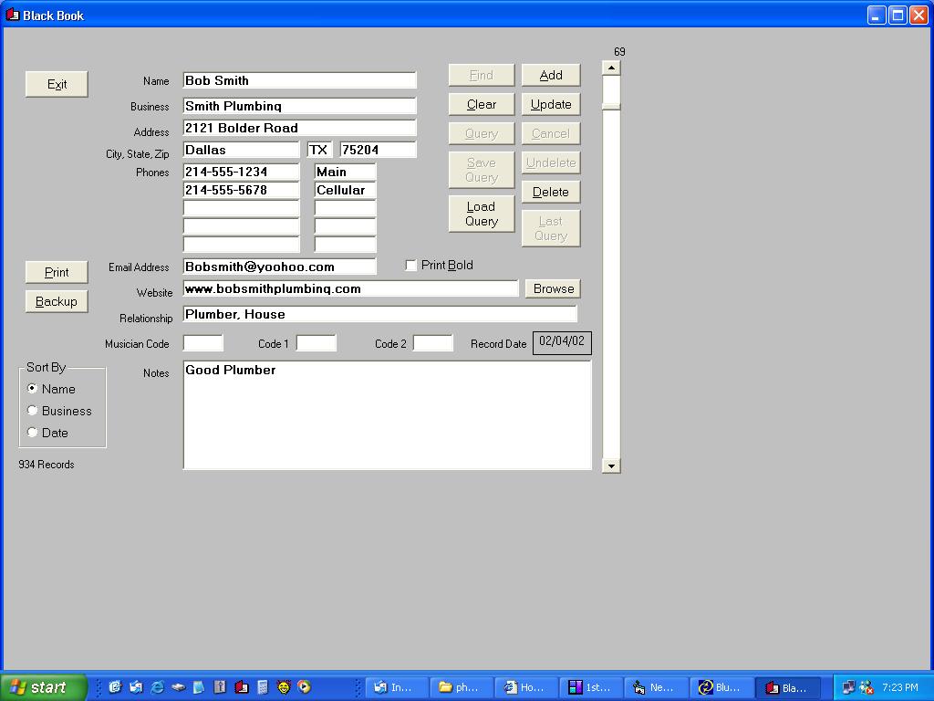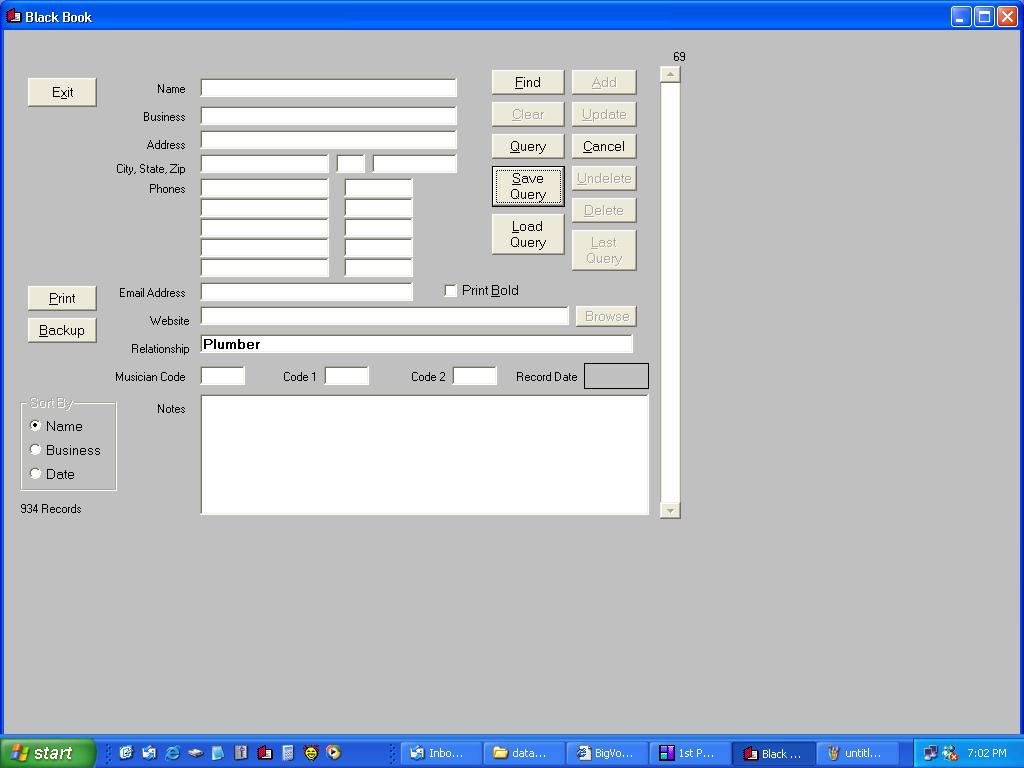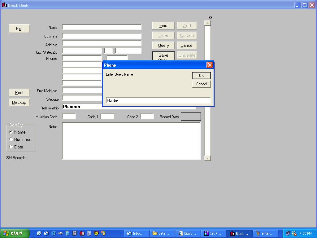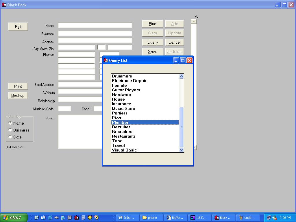 The Main ScreenA Phone database that allows you to enter name, business name, address, phon e #'s, email address, website URL, relationship, codes, and notes. It allows you to create queries based on the "like" value of any field and then name and store those queries for later recall. The product is written in Visual Basic with an Access database "backend" so you will always have access to all of your data in a standard Microsoft Access database format. It has a scroll bar so you can find the exact name you are looking for with just a mouse, without having to use the keyboard.